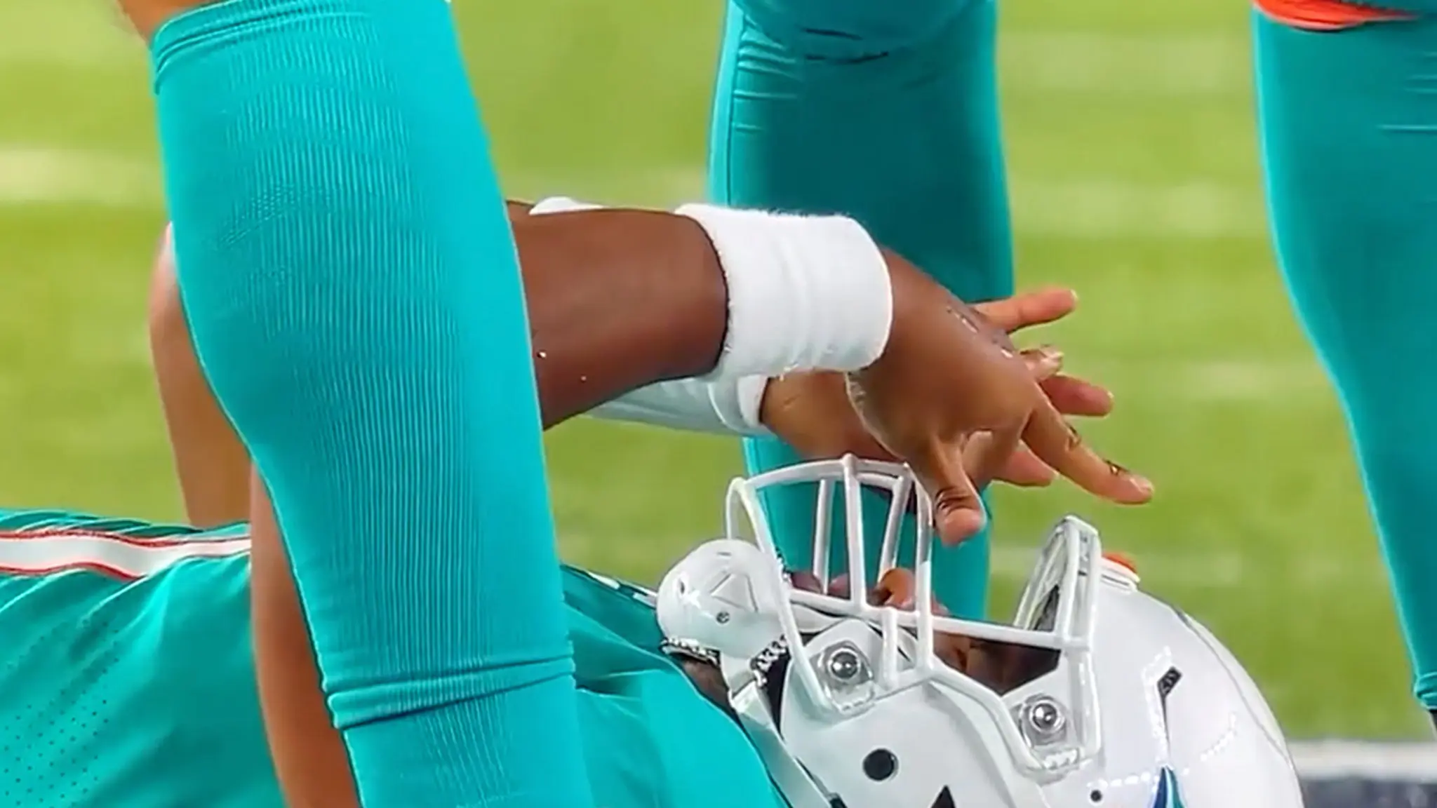 Le quarterback des Dolphins, Tua Tagovailoa, a été victime d’un terrible choc aux cervicales, après être retombé sur l’arrière du crâne. Ses doigts se sont aussitôt raidis au-dessus de son visage, laissant craindre le pire.
