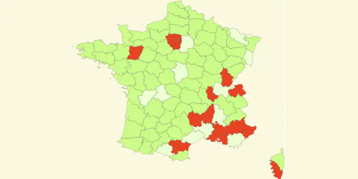 Sont concernés l'Ain, l'Ariège, la Charente, le Cher, la Drôme, le Gard, l'Hérault, la Moselle, le Haut-Rhin, le Var, la Haute-Vienne et la Seine-et-Marne. Le masque redevient en revanche obligatoire pour les élèves de primaire en Lozère, où le taux d’incidence a dépassé 104 nouveaux cas pour 100 000 habitants cette semaine.
