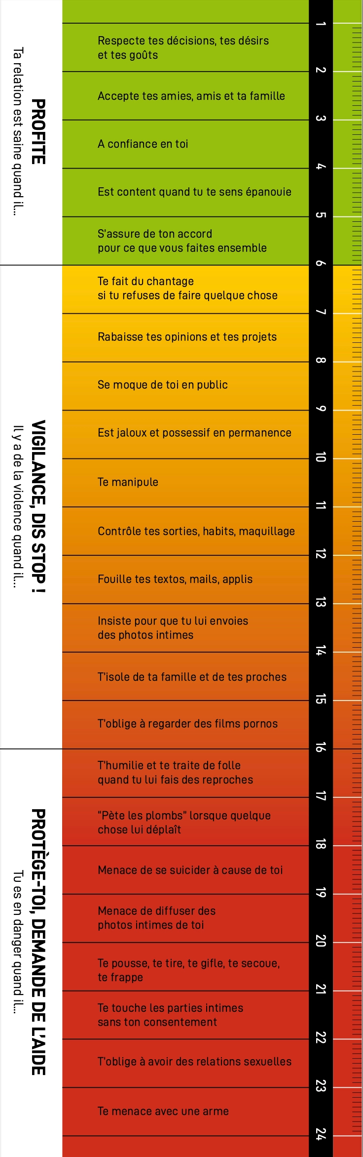 Ce dispositif aide à analyser sa relation et à vérifier si elle est fondée sur le consentement et dénuée de violence. Elle prend la forme d'une règle, constituée de trois parties : verte ("Profite, ta relation est saine"), orange ("Vigilance, dis stop, il y a des violences quand il se moque de toi, te manipule, etc.) et rouge ("Protège-toi, demande de l'aide, tu es en danger").