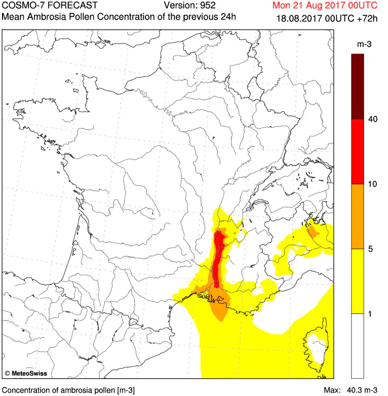 Comme le montre cette carte produite par MeteoSuisse et décrite par le RNSA, le risque d'allergie est très élevé de Lyon à Montélimar et sur le Nivernais.