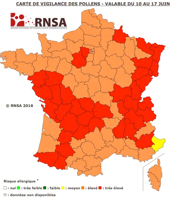 "Le risque d'exposition lié à ces pollens est élevé à très élevé sur une grande partie de la France, notamment dans les pays de la Loire et en Rhône-Alpes" a indiqué vendredi à l'AFP, Charlotte Sindt, présidente du Réseau national de surveillance aérobiologique RNSA. « Le retour de températures plus chaudes et d'averses plus espacées a fait exploser cette semaine la teneur de l'air en pollens de graminées », explique-t-elle.
