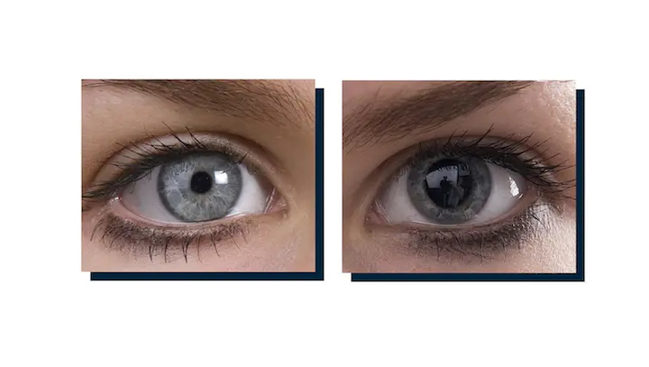 C’est ce qu’illustre cette photo, avec à gauche et à droite les yeux d’une même personne mais la pupille de gauche rétrécie exprimant plus une émotion sévère ou négative, et la pupille de droite dilatée une émotion positive.