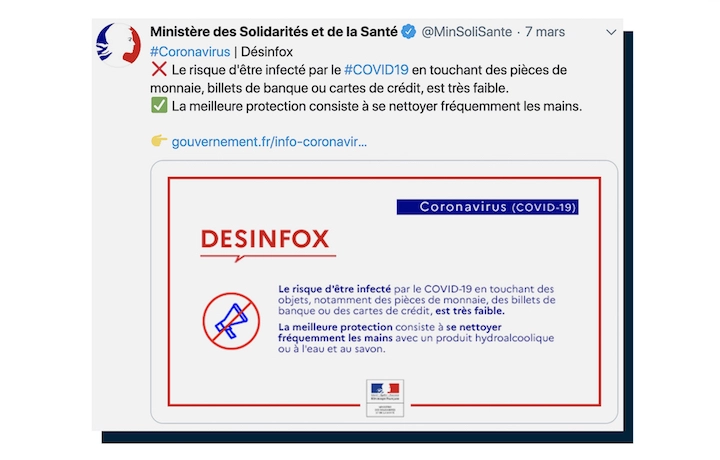 Il a rappelé dans un tweet que le risque d’être infecté en touchant pièces, billets ou cartes de crédit était très faible.