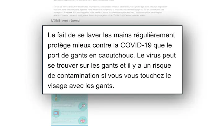 L’organisation mondiale de la santé (OMS) l’a écrit noir sur blanc sur son site : "le fait de se laver les mains régulièrement protège mieux contre le Covid-19 que le port de gants en caoutchouc. Le virus peut se trouver sur les gants et il y a un risque de contamination si vous vous touchez le visage avec les gants".