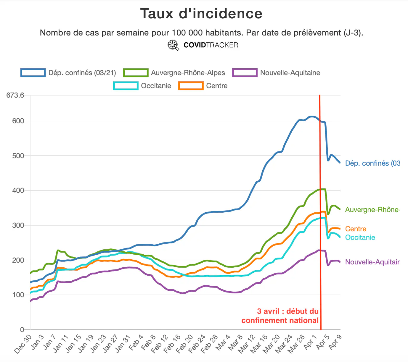 Le taux d’incidence a continué d’augmenter jusqu’à s’effondrer le lundi férié de Pâques, le 5 avril. Puis, selon la région concernée, il est resté stable comme dans la région Centre (courbe orange) ou a continué à diminuer comme en Occitanie (courbe bleu ciel).