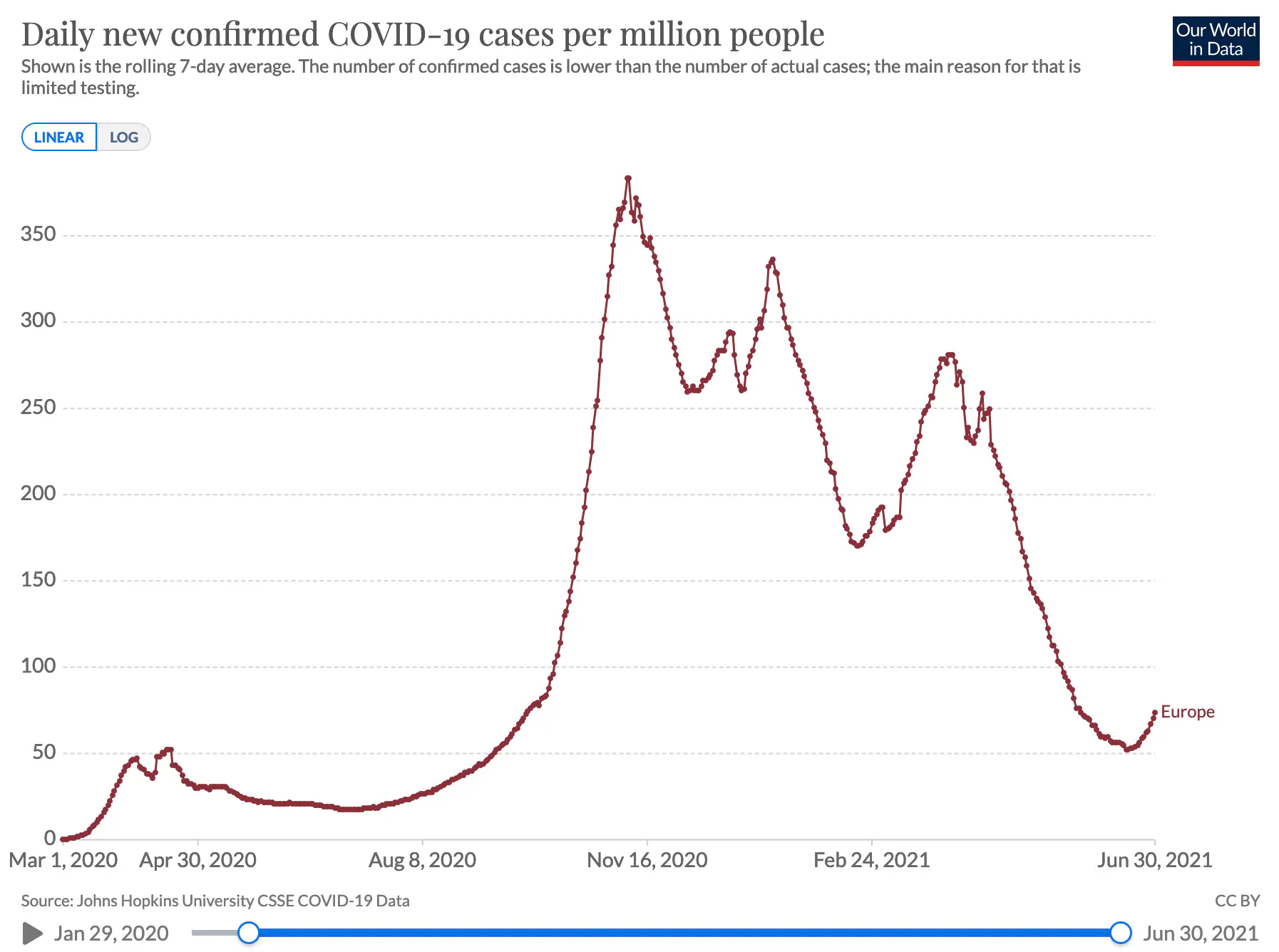 Une hausse bien visible sur le graphique ci-dessous, qui représente le nombre de nouveaux cas de covid par million de personnes en Europe, du 1er mars 2020 au 30 juin 2021.