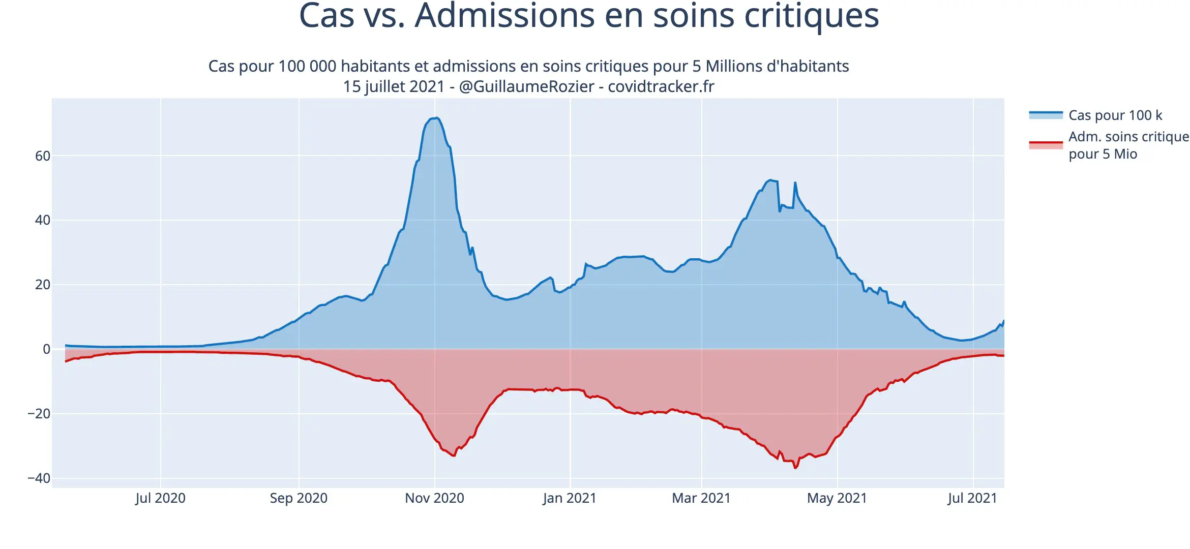 Ces deux graphiques, publiés par l’ingénieur Guillaume Rozier, fondateur du site CovidTracker, le montrent bien. Sur le premier graphique, la courbe bleue représente le nombre de cas et la rouge celle des admissions en soins critiques. Un léger décalage s’observe entre les deux courbes.