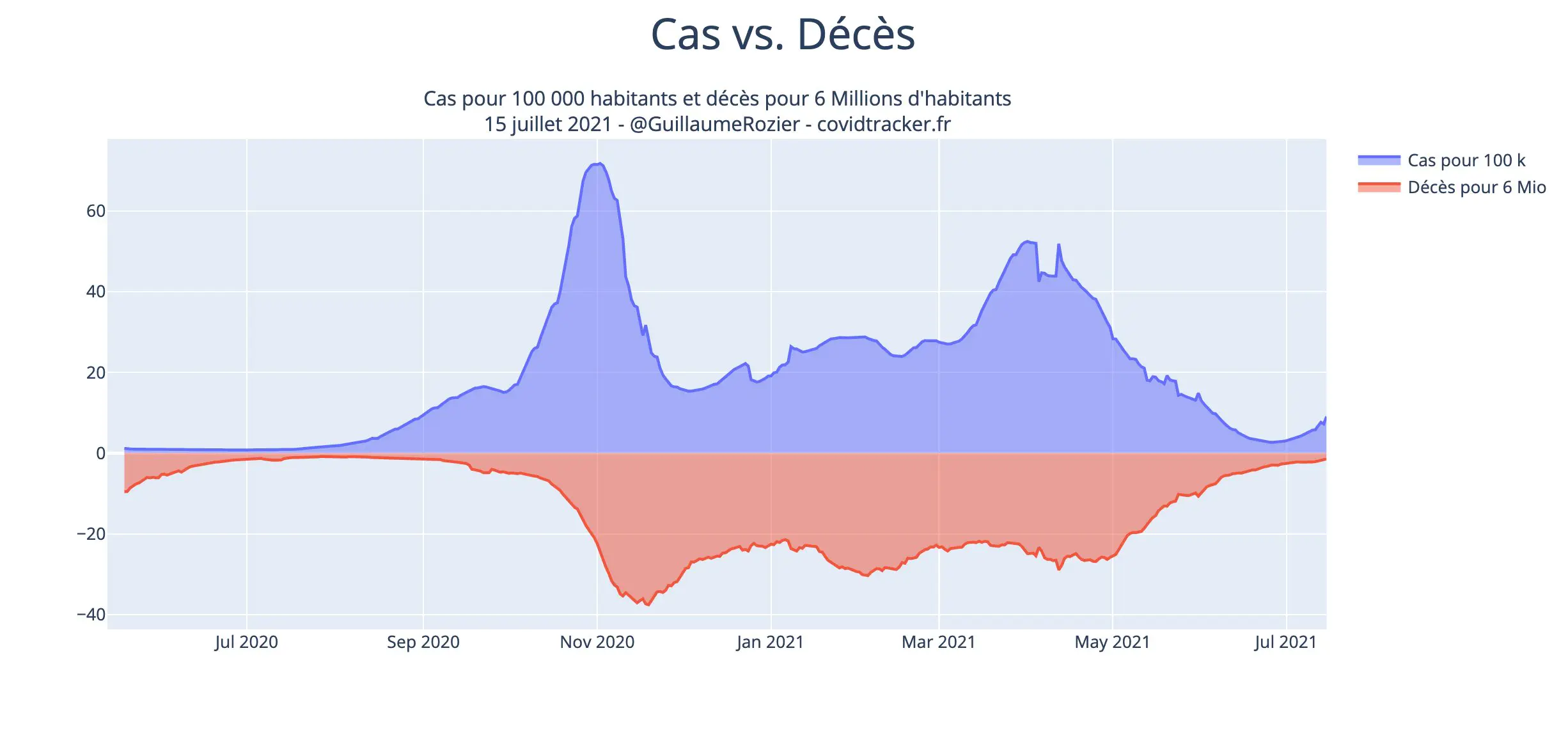 Sur ce deuxième graphique, la courbe violette représente le nombre de cas et la rouge celle des décès. Le décalage dans le temps est ici encore plus marqué.