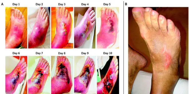 Les photographies présentées en A décrivent le développement de la maladie sans traitement spécifique - les médecins espérant une cicatrisation spontanée. Le patient fut ensuite traité sous antibiotiques durant trois semaines. Le cliché B présente le pied trois années plus tard.