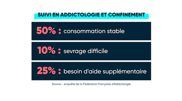Dans une enquête de la Fédération Française d’Addictologie de modeste ampleur auprès de 188 personnes suivies en addictologie, elles n’étaient qu’un tiers environ à déclarer avoir pu " gérer" leurs consommations. Seule la moitié environ des usagers trouvaient que leurs consommations n’avaient pas bougé. Les difficultés psychologiques étaient évoquées plus souvent que les questions d’approvisionnement.