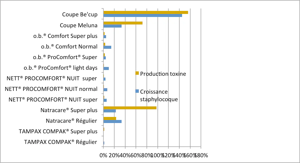 Les coupes menstruelles, comme la Be'Cup ou la Meluna, sont toutefois plus favorables à la croissance de la toxine que les tampons et serviettes. Elles permettent en effet une arrivée d'air plus importante, et donc d'oxygène, ce qui favorise la croissance du staphylocoque. L'étude conseille donc de ne pas les porter la nuit pendant son sommeil et le jour plus de six heures.