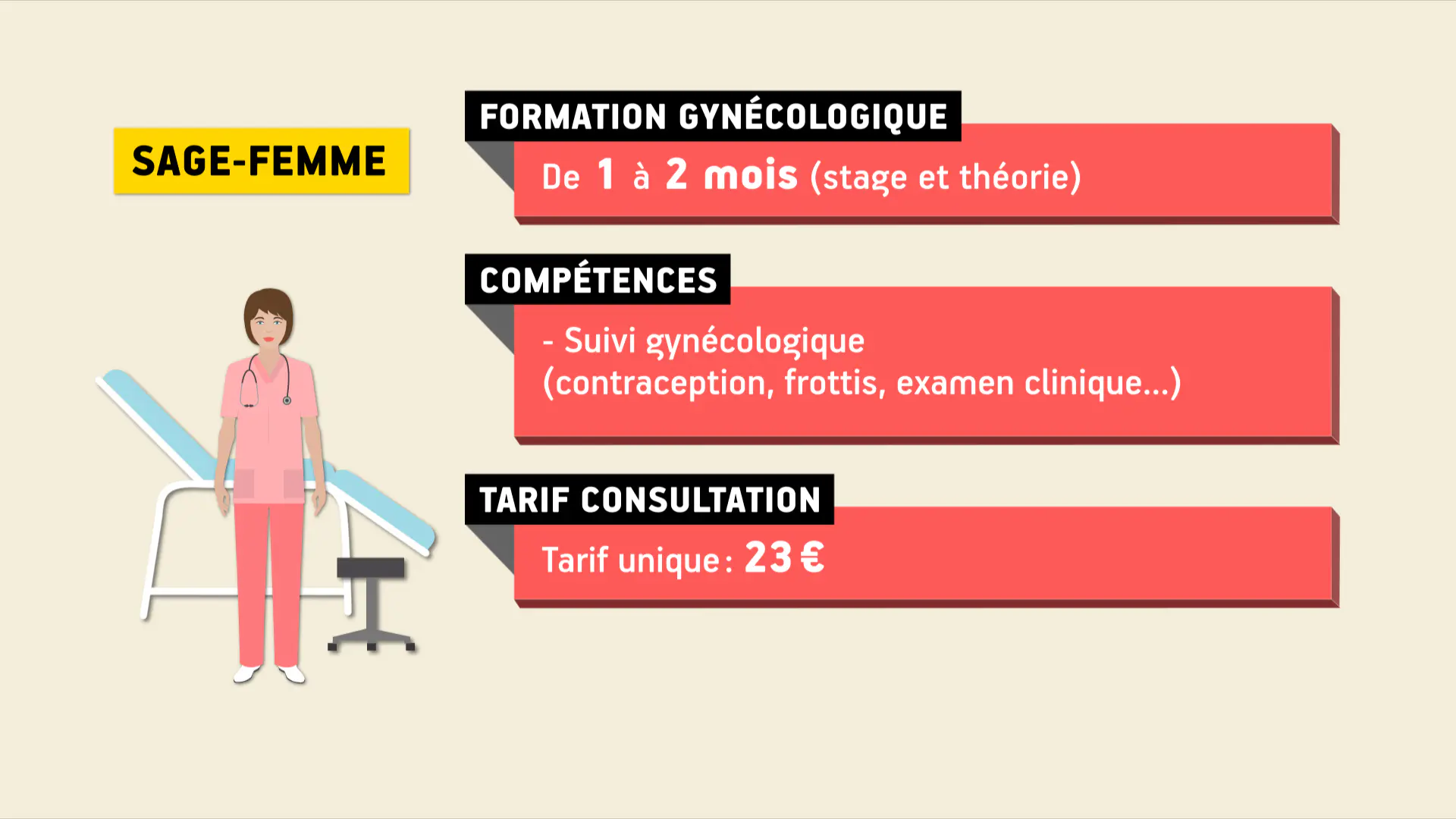 Sur ses cinq années d'étude, la sage-femme suit un enseignement de deux mois de théorie et de pratique en gynécologie médicale. Le prix de sa consultation, unique, est fixé à 23 euros.