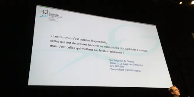"Les femmes, c'est comme les juments, celles qui ont de grosses hanches ne sont pas les plus agréables à monter, mais c'est celles qui mettent bas le plus facilement." Cette phrase, issue du roman Le Seigneur de Châlus d'Yves Aubard (2012), a été projetée lors d’une conférence au cours des 42e Journées du Collège national des gynécologues et obstétriciens français (CNGOF). La diapositive, prise en photo, a immédiatement circulé sur Twitter, où est apparu le hashtag #jenesuispasunejument.