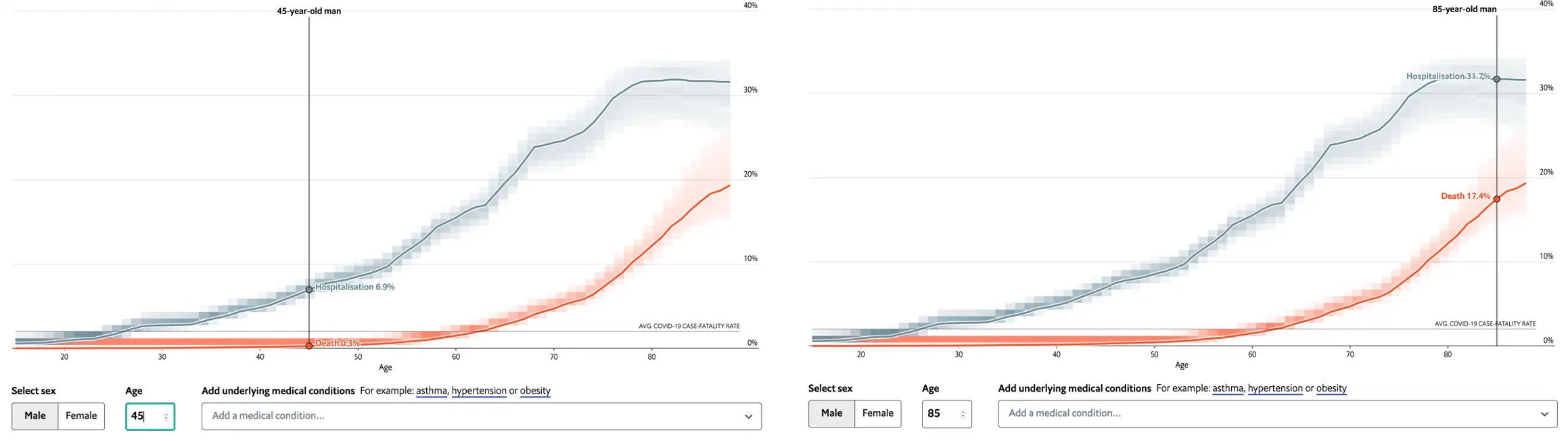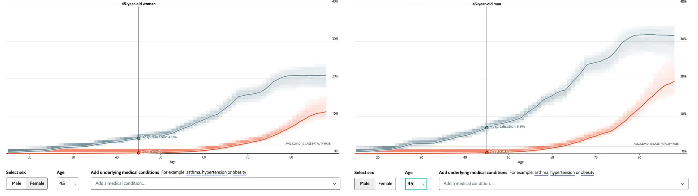 Cet outil montre aussi bien les différences de risque qui existent entre homme en femme. Ainsi, sans comorbidité connue, une femme de 45 ans a un risque d’hospitalisation de 4% et un risque de décès 0,2%. Alors qu’un homme du même âge, également sans comorbidité, a un risque d’hospitalisation de 6,9% et un risque de décès 0,3%.