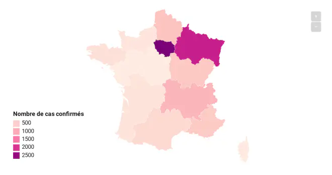 Comme le montre notre carte, deux régions ont désormais passé le cap des deux mille cas cumulés : l’Île-de-France et le Grand Est.