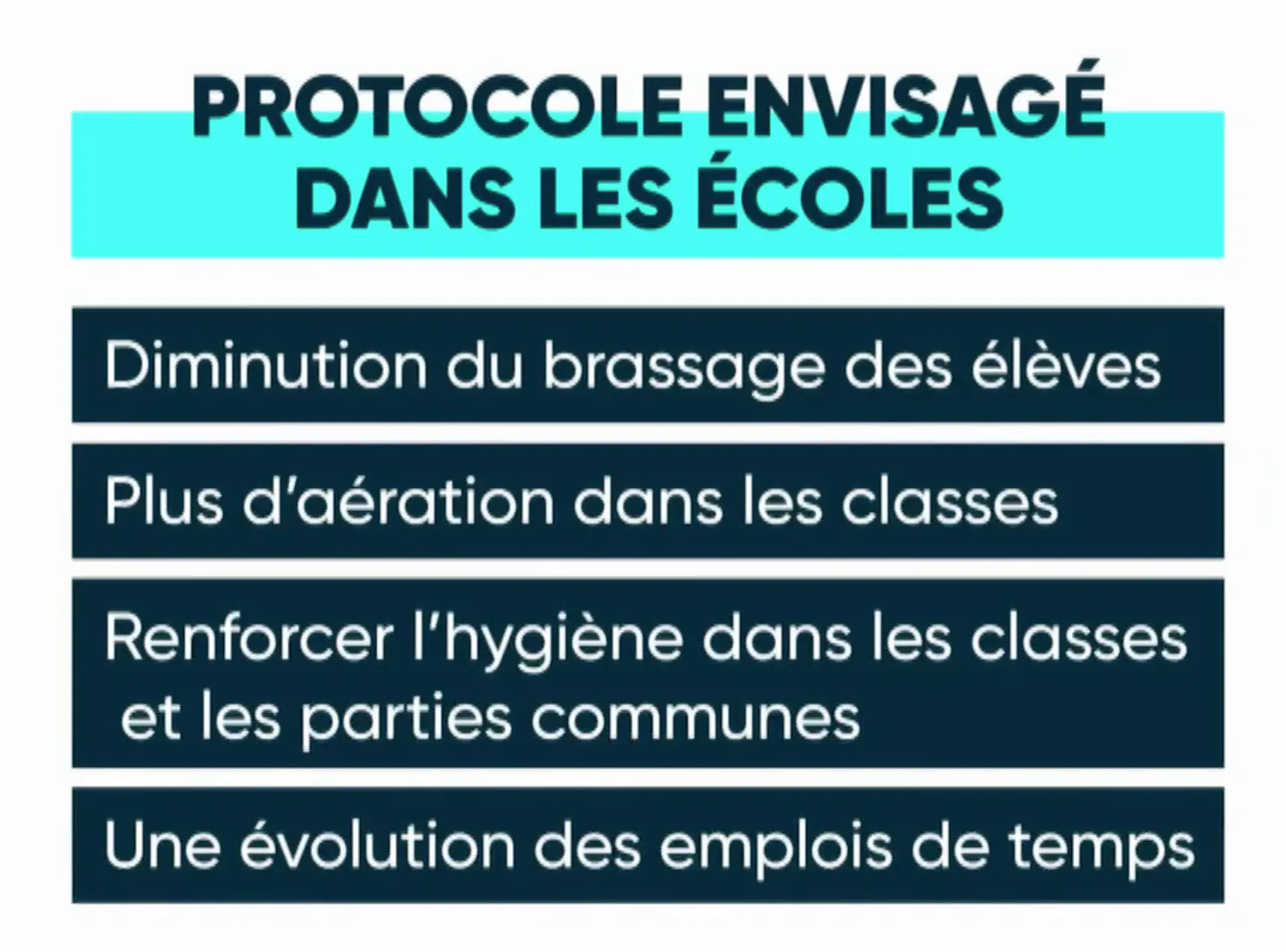 Eviter le brassage des classes, renforcer les mesures d’hygiène permettrait de renforcer le protocole. Certains spécialistes encouragent à dépister les enfants. Si un adulte est positif à la maison, un enfant dépisté sera rapidement isolé et évitera de potentielles contaminations à l’école.