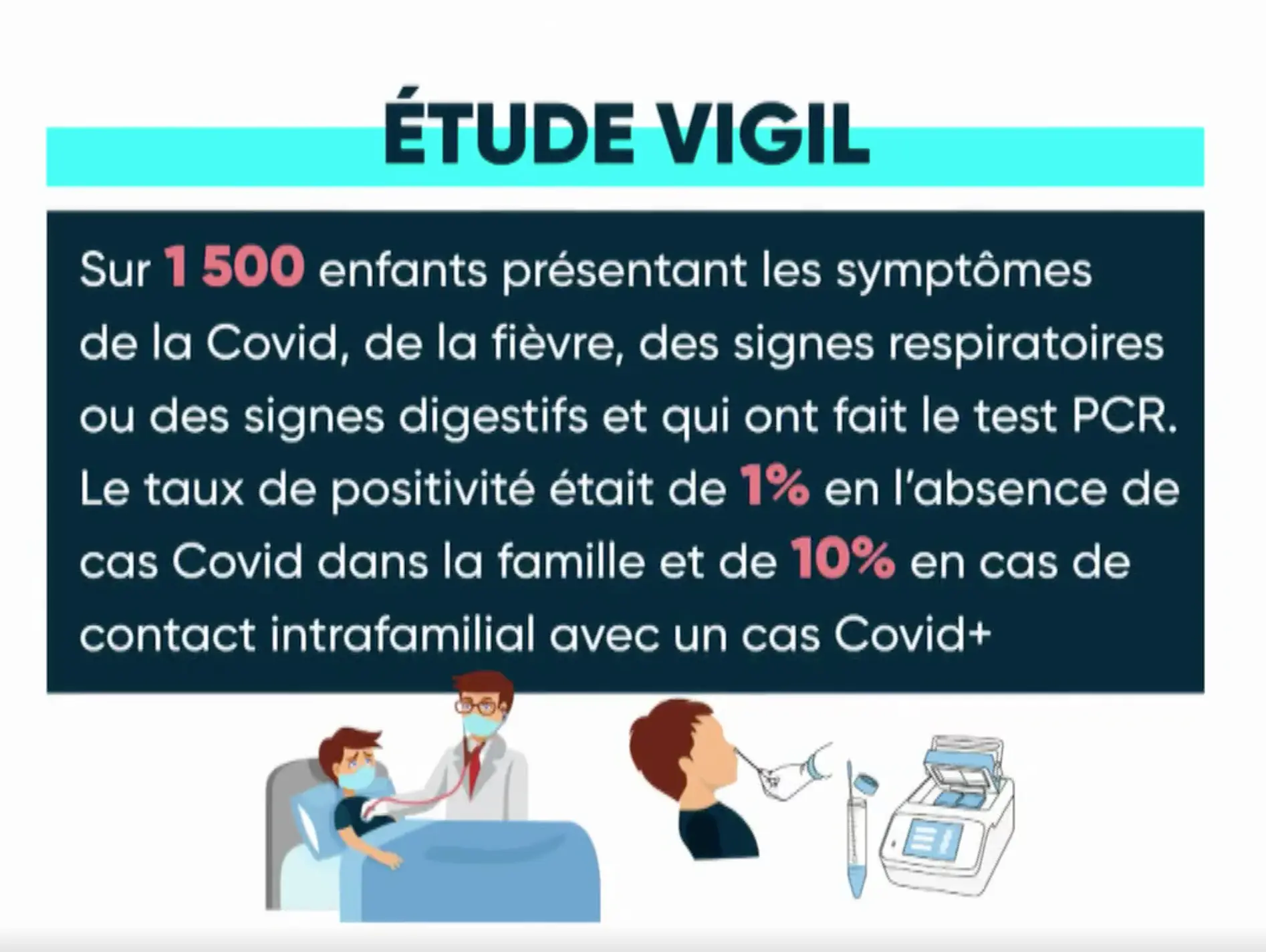 Une autre étude, menée en France, l’étude Vigil, est en cours a été réalisée auprès de pédiatres libéraux et dans plusieurs services d’urgences pédiatriques. D'après elle, le principal facteur de risque pour un enfant d’être infecté par le SARSCoV2 est d’avoir un parent malade.
