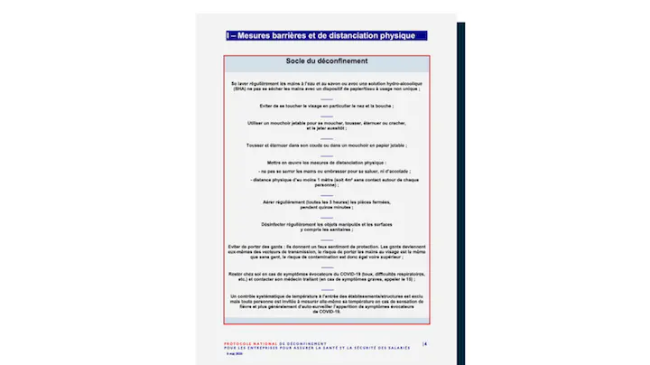 Le ministère du Travail a publié début mai un protocole de déconfinement et de reprise du travail. Il y rappelle tous les gestes barrières à respecter comme se laver régulièrement les mains au savon ou avec une solution hydro-alcoolique, ne pas se toucher le visage, tousser dans son coude, utiliser un mouchoir à usage unique...