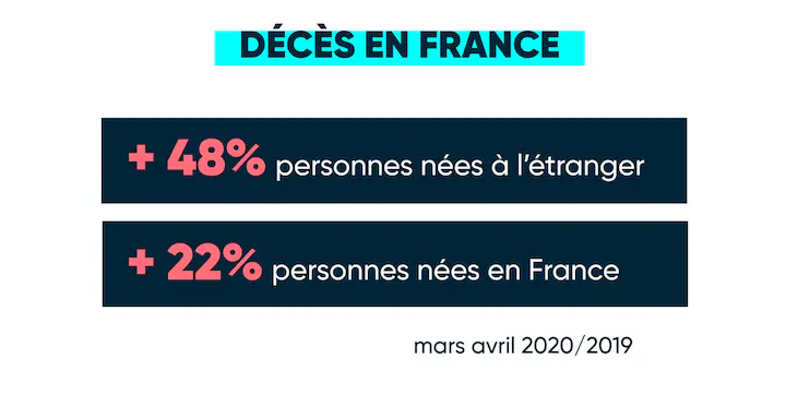 Dans ces décès en France, on enregistre une hausse de la mortalité de 48% chez les personnes nées à l’étranger, contre 22% pour les personnes nées en France.