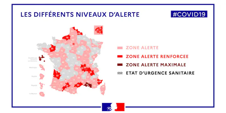 Au total, 69 départements sur 101 sont classés en zone d'alerte. Dans ces zones, "les fêtes, mariages, tombolas, événements associatifs, anniversaires, communions devront se tenir en petit comité, à moins de 30 personnes" a précisé le ministre.