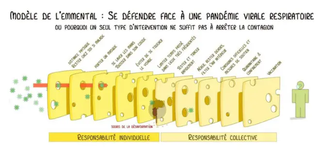Car un seul geste barrière ne suffit pas à lutter contre le coronavirus. C’est l’addition de chaque geste (masque, lavage de mains, distance physique, distance sociale…) qui aboutit in fine à une protection maximale contre la covid. Pour illustrer cette idée, le virologue australien Ian Mackay a mis au point le modèle du "swiss cheese" (emmental en français).