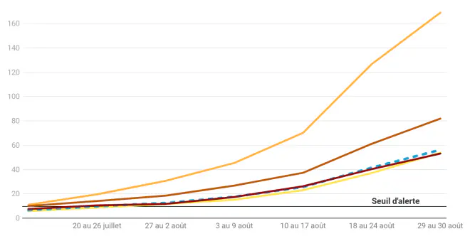 Le taux d’incidence, qui mesure le nombre de nouveaux cas de covid par rapport à la population, ne cesse de grimper depuis juillet. Santé Publique France parle de « progression exponentielle » de l’épidémie dans son point épidémiologique du 3 septembre.