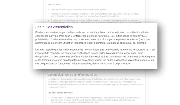 Enfin l'Agence nationale de sécurité sanitaire (Anses) a aussi été très claire en soulignant sur son site que "les huiles essentielles ne constituent pas un moyen de lutte contre le coronavirus" et que ces produits ne doivent pas être utilisés dans certains cas.