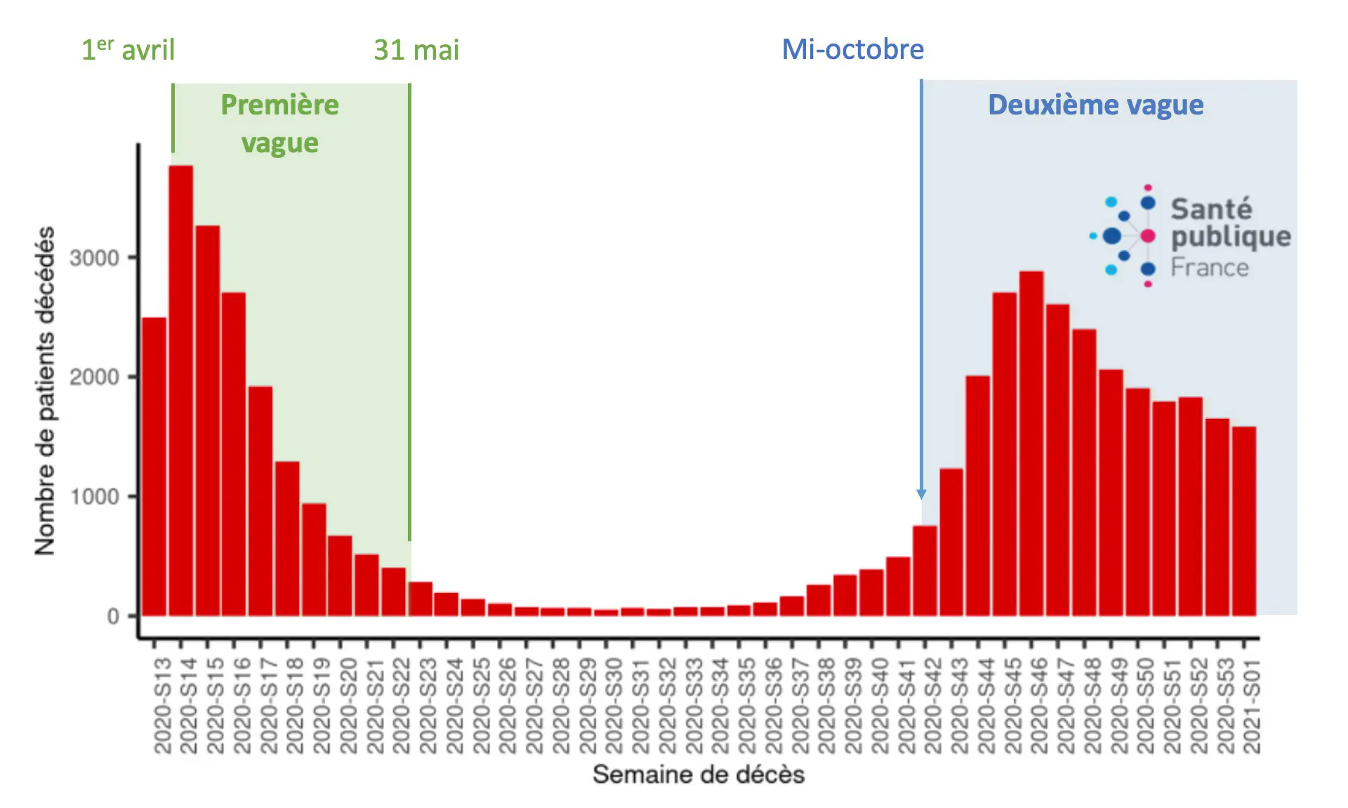 Nombre hebdomadaire de décès de patients covid du 2 mars au 12 janvier 2021. Source : Santé publique France, Point épidémiologique hebdomadaire du 14 janvier 2021.