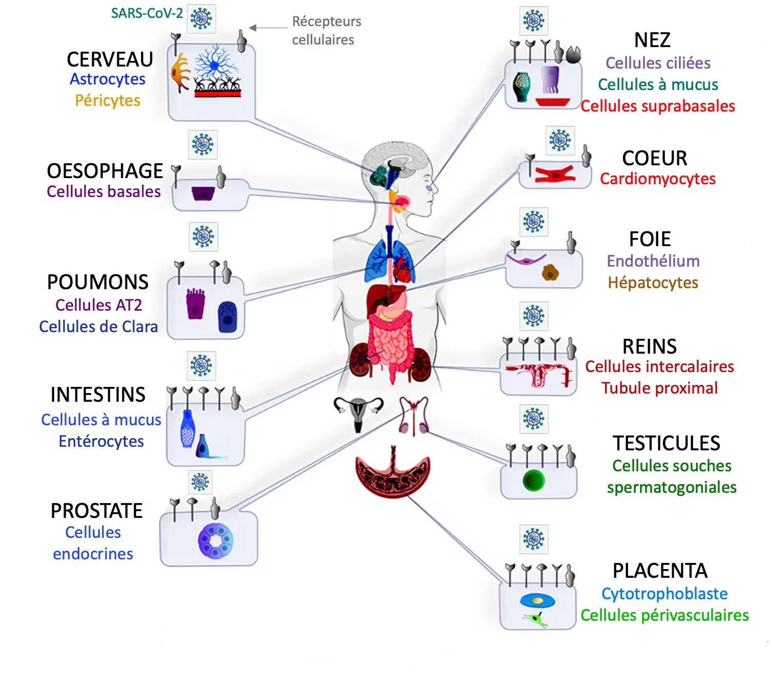 Poumons, nez, reins, cœur, testicules… les cellules de nombreux organes et tissus du corps humain possèdent des récepteurs qui facilitent la fixation et l’infiltration du coronavirus.