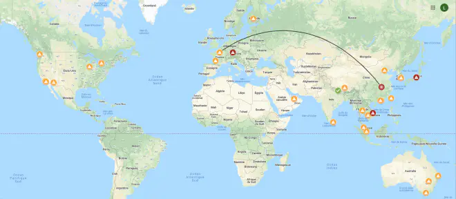 Chaque point situe un endroit où au moins un malade a été signalé. Les points rouges sont ceux où une transmission d'humain à humain a eu lieu en dehors de Chine. Le point vert du Népal montre le seul endroit où le coronavirus s'est manifesté, mais où il ne se trouve plus.
