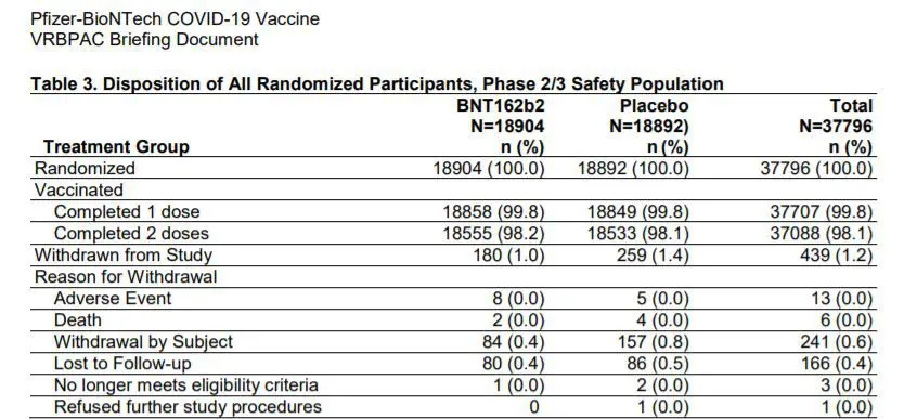 Sur une ligne de ce rapport on peut lire “Death : Total : 6”, traduction : six personnes sont mortes pendant les essais du vaccin Pfizer. Mais quand on regarde de plus près, ce n’est pas aussi simple.