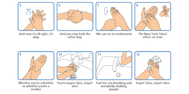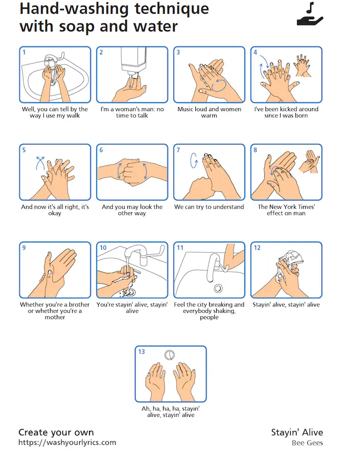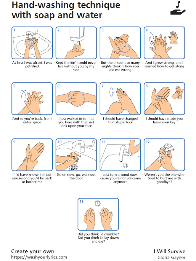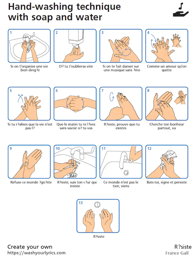 Il produit ensuite une affiche qui associe chaque étape du lavage de mains à une phrase de l’extrait. Il ne vous reste donc plus qu’à fredonner ce texte en frottant vos mains au savon.