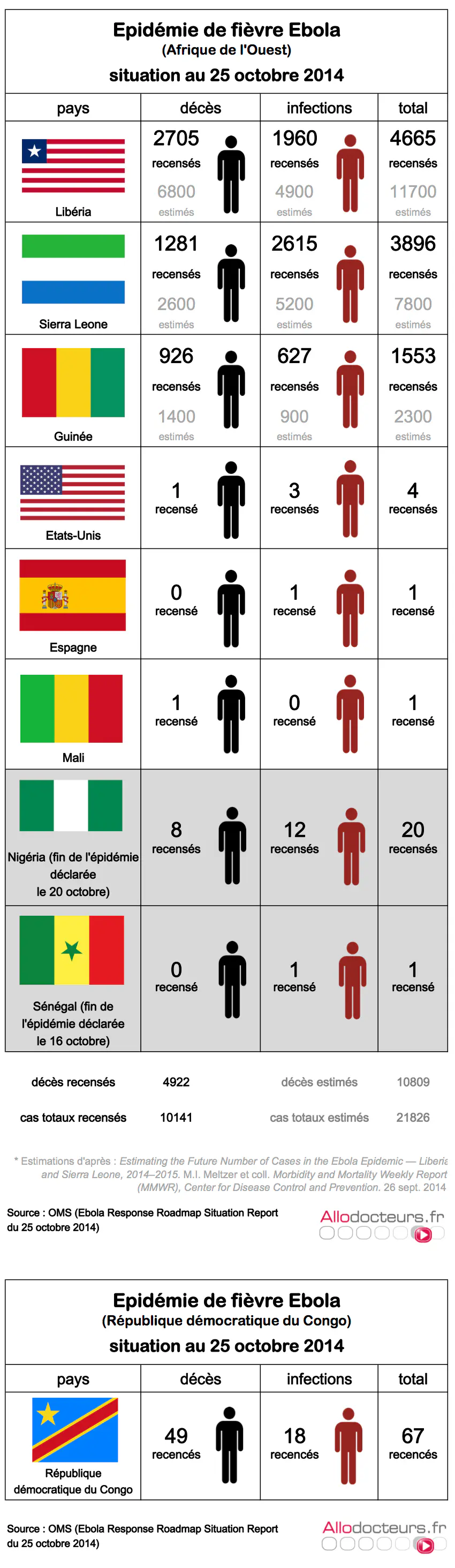 Le seuil des 10.000 cas d'Ebola a été dépassé, selon un rapport de l'OMS rendu le 25 octobre. Au total, 10.141 cas confirmés, probables et suspectés ont été recensés dans le monde depuis le début de l'épidémie en février 2014. Cependant, sur ces 10.141 cas, seuls 5.693 ont été confirmés. Soit seulement 56%. Pour établir ce chiffre, l'OMS s'est basée sur les données des ministères de la Santé des six pays touchés par le virus (Sierra Leone, Guinée, Libéria, Etats-Unis, Mali, Espagne) et des deux pays où l'épidémie a été endiguée (Nigéria et Sénégal).