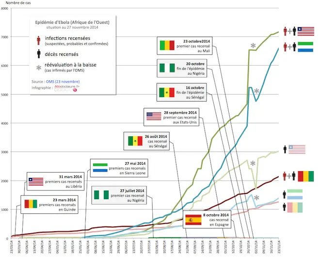 Selon le dernier bilan de l'OMS daté du 23 novembre, l'épidemie d'Ebola a fait au moins 5.689 morts, sur 15.935 cas recensés (voir ci-dessous).