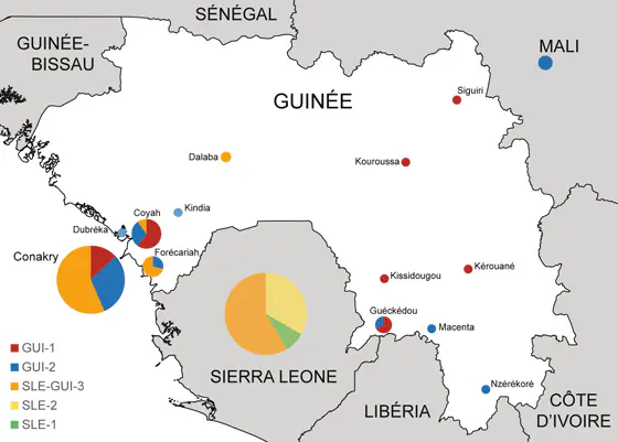 Le premier variant apparait très proche de celui identifié dans les prélèvements réalisés au tout début de l’épidémie, en mars 2014, peu après l’apparition des premiers cas en Guinée. Le CNRS souligne que ce variant "se retrouve uniquement en Guinée, à la fois dans les régions urbaines (Conakry) et les régions forestières". (Sur la carte ci-dessous, il s'agit du variant GUI-1, représenté en rouge)