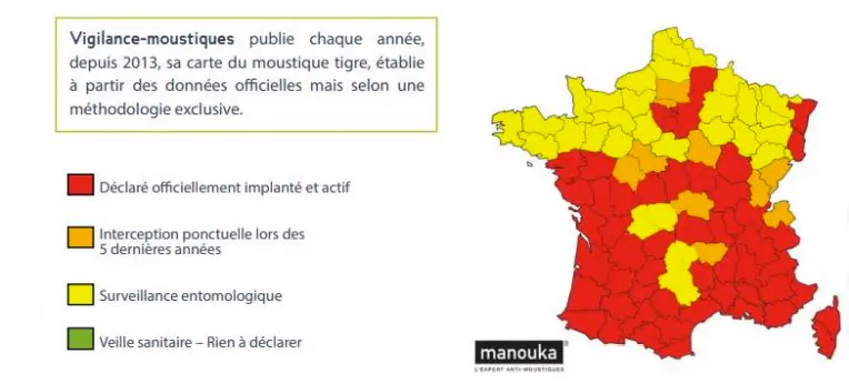 Par ailleurs, 10 départements sont désormais en vigilance orange, ce qui signifie que le moustique y a été intercepté ponctuellement dans les cinq dernières années. Ces départements sont l’Allier, le Doubs, l’Indre et Loire, le Jura, le Loir et Cher, la Haute Loire, l’Oise, la Haute Savoie, l’Yonne et le Val d’Oise.