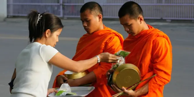 La tradition de proposer des offrandes en nature aux moines bouddhistes est très ancrée en Thaïlande. Hélas, les ancestrales oboles de riz se sont transformées ces dernières années en paniers de "junk-food" (chips, boissons énergétiques…). Dans les supermarchés, des rayons entiers sont consacrés à ces offrandes toutes prêtes, empilées dans un seau jaune.