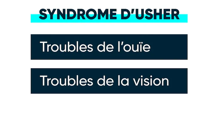 Le syndrome d’Usher est une maladie génétique rare qui associe des troubles de l’ouïe et des troubles de la vision. Il y a 3 types. Le type 1 est la forme la plus sévère. Marie est atteinte du type 2.