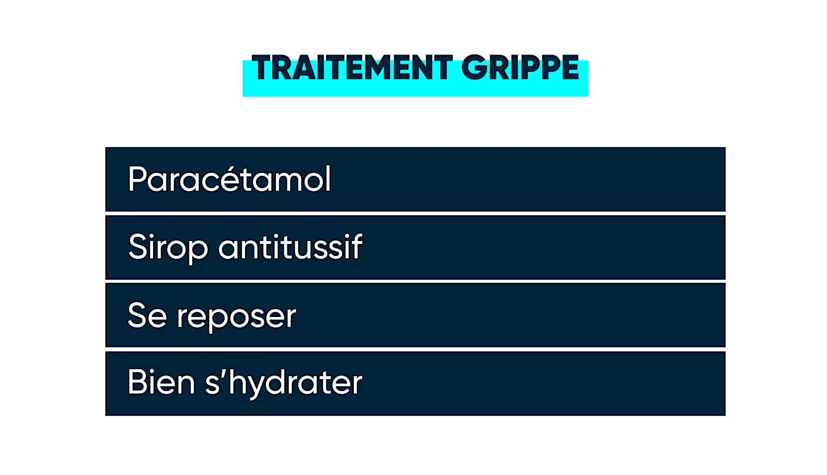 Le traitement repose sur le traitement des symptômes de la grippe. On prescrit du paracétamol pour la fièvre et les douleurs, éventuellement un sirop anti-tussif si la toux est sèche et très invalidante. On donne au patient des conseils simples : se reposer, bien s'hydrater, privilégier une alimentation pleine de vitamines. Dans la grande majorité des cas, le patient n'aura rien de plus qu'une semaine de fièvre au lit...