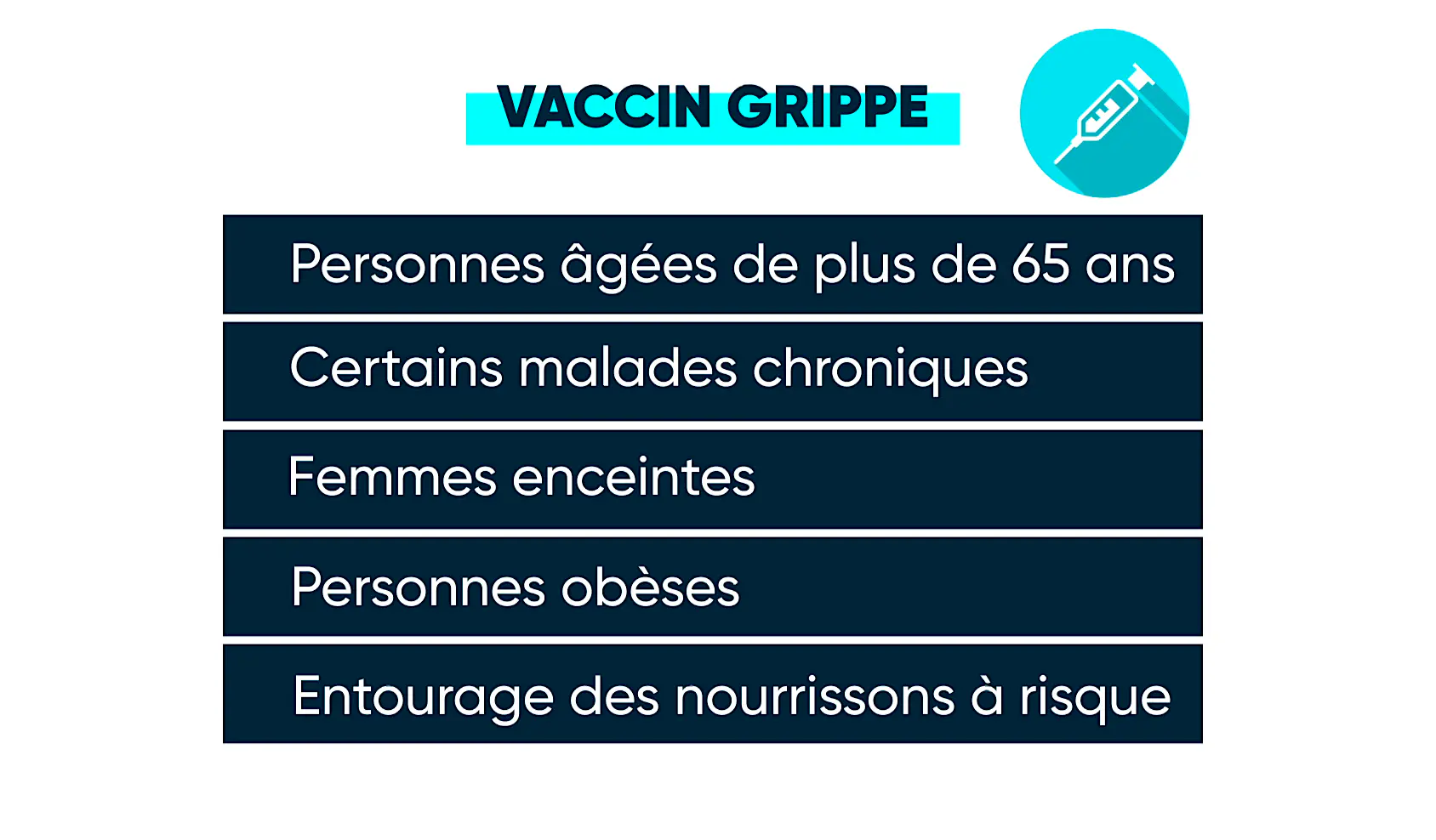 La meilleure façon de se protéger de la grippe et de ses complications, c'est en premier lieu de se faire vacciner chaque année. La vaccination est absolument recommandée pour les populations à risque : les patients de plus de 65 ans, les insuffisants respiratoires et cardiaques, les personnes atteintes d'une pathologie chronique, les patients obèses et les femmes enceintes. L'entourage et les parents des enfants fragiles (prématurés, pathologies respiratoires...) doivent aussi le faire pour ne pas leur transmettre la grippe !