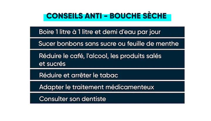 Un manque d’hydratation, le vieillissement, est aussi souvent dû à un effet secondaire lié à la prise d’un médicament (antidépresseurs, anxiolytiques, antihistaminiques, antihypertenseurs, antiparkisoniens…) la liste est longue, ça peut-être aussi un effet secondaire de la radiothérapie, un signe de diabète, de maladie rénale ou encore d’un syndrome très particulier qui induit une forte sécheresse buccale et surtout oculaire : le syndrome de Goujerot-Sjögren. C’est donc important de se poser la question : "Est-ce que je bois suffisamment ? Est-ce que je prends un médicament qui peut favoriser cette sécheresse de la bouche ? Depuis quand j’observe ce symptôme ? Et surtout de consulter son médecin si cela ne va pas en s’améliorant…