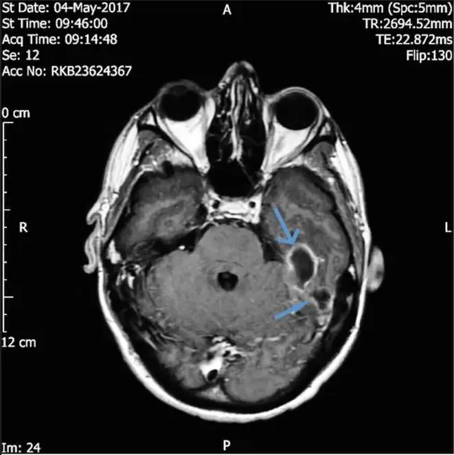 Crédits Photo : © Charlton et al., BMJ Case Report, 2019. Sur le scanner du patient, les deux abcès intracrâniens sont indiqués par des flèches bleues.