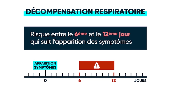 Entre le 6ème et le 12ème jour qui suit l’apparition des symptômes, il arrive parfois que des personnes qui étaient jusqu’à présent peu atteintes, souffrent assez soudainement d’une décompensation respiratoire, c’est-à-dire une baisse du niveau d’oxygène dans le sang.