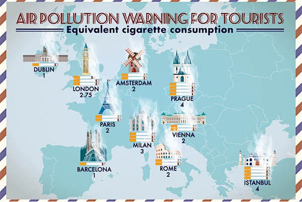 Vous aviez prévu de prendre un grand bol d'air à Prague à l'occasion d'un week-end prolongé ? Cela coûtera à vos poumons l'équivalent de quatre cigarettes. Trois à Milan. Deux à Amsterdam, Vienne et Paris. Une à Dublin... C'est la conclusion d'une étude publiée par l'ONG européenne Transport&Environment. Les capitales européennes sont si polluées qu'y passer quelques jours serait aussi néfaste pour la santé que de fumer des cigarettes. Le Parisien note ainsi que sur une année, un Parisien " fume" 183 cigarettes, soit 9 paquets, sans même allumer une cigarette.