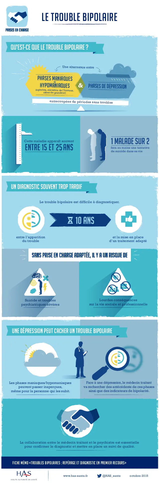 Source : Patient avec un trouble bipolaire : repérage et prise en charge initiale en premier recours. Fiche mémo de la HAS, 6 octobre 2015.