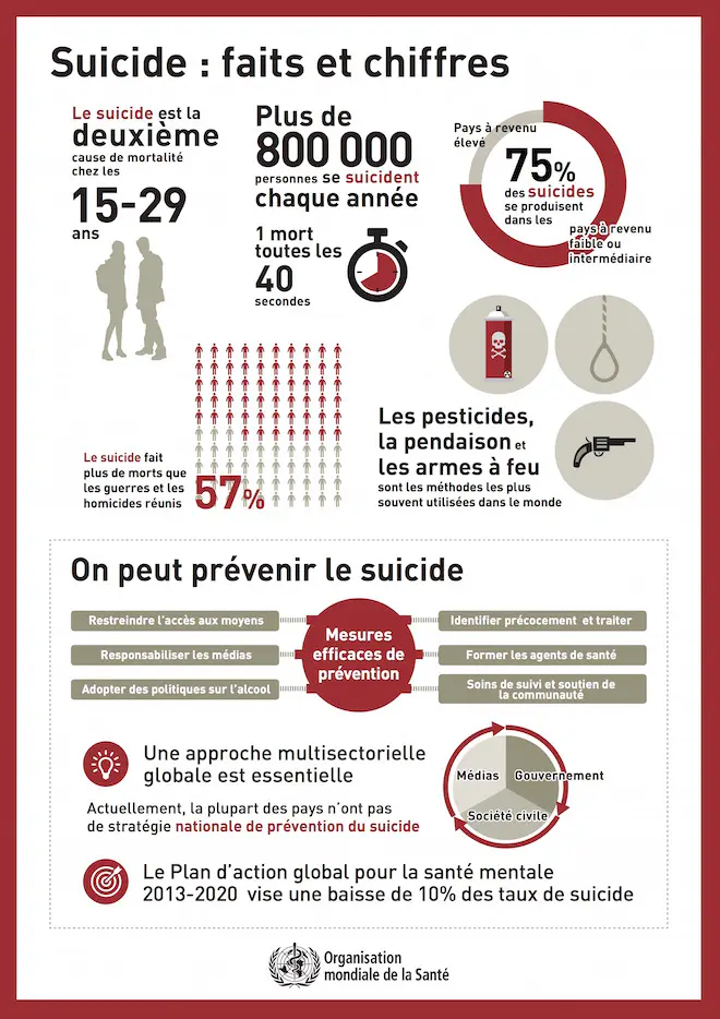 Dans un rapport exhaustif sur le suicide présenté en 2014, l'Organisation mondiale de la Santé (OMS) dénombre plus de 800.000 personnes qui, chaque année, mettent fin à leurs jours. Cela signifie que, toutes les 40 secondes, une personne se suicide quelque part dans le monde. Les tentatives de suicide, elles, seraient vingt fois plus nombreuses.