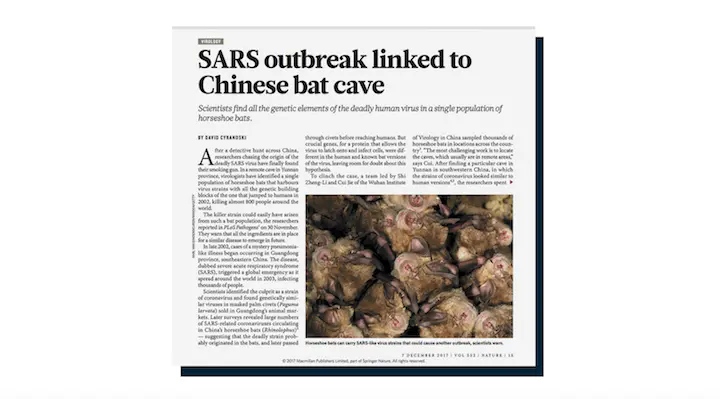 En décembre 2017, le prestigieux magazine Nature avait alerté avec un article de David Cyranoski qui rappelait que le village à l’origine du SRAS était situé à 1 km de la grotte d’où provenait le virus, et qu’en conséquence, le risque d’un nouveau "débordement ", avec de nouvelles maladies à la clé était important.
