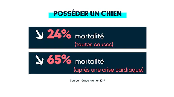 On sait depuis longtemps que posséder un chien est associé à une diminution des facteurs de risques cardio-vasculaires, une diminution de la pression artérielle, une amélioration du profil lipidique, une diminution des effets délétères du stress, mais peu de travaux étaient consacrés à l’action des chiens sur la survie des maîtres. Plusieurs études récentes (Kramer, 2019, Mubanga 2019) comblent cette lacune.