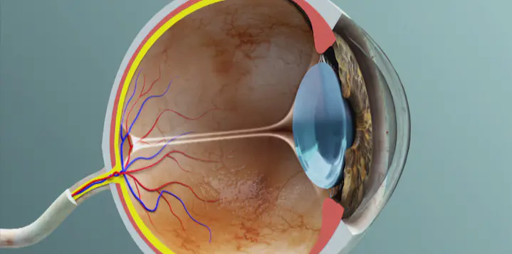 L'oeil se compose de la pupille, du cristallin, de la rétine et du nerf optique en jaune. La choroïde, c’est la couche rose qui est sous la rétine.
