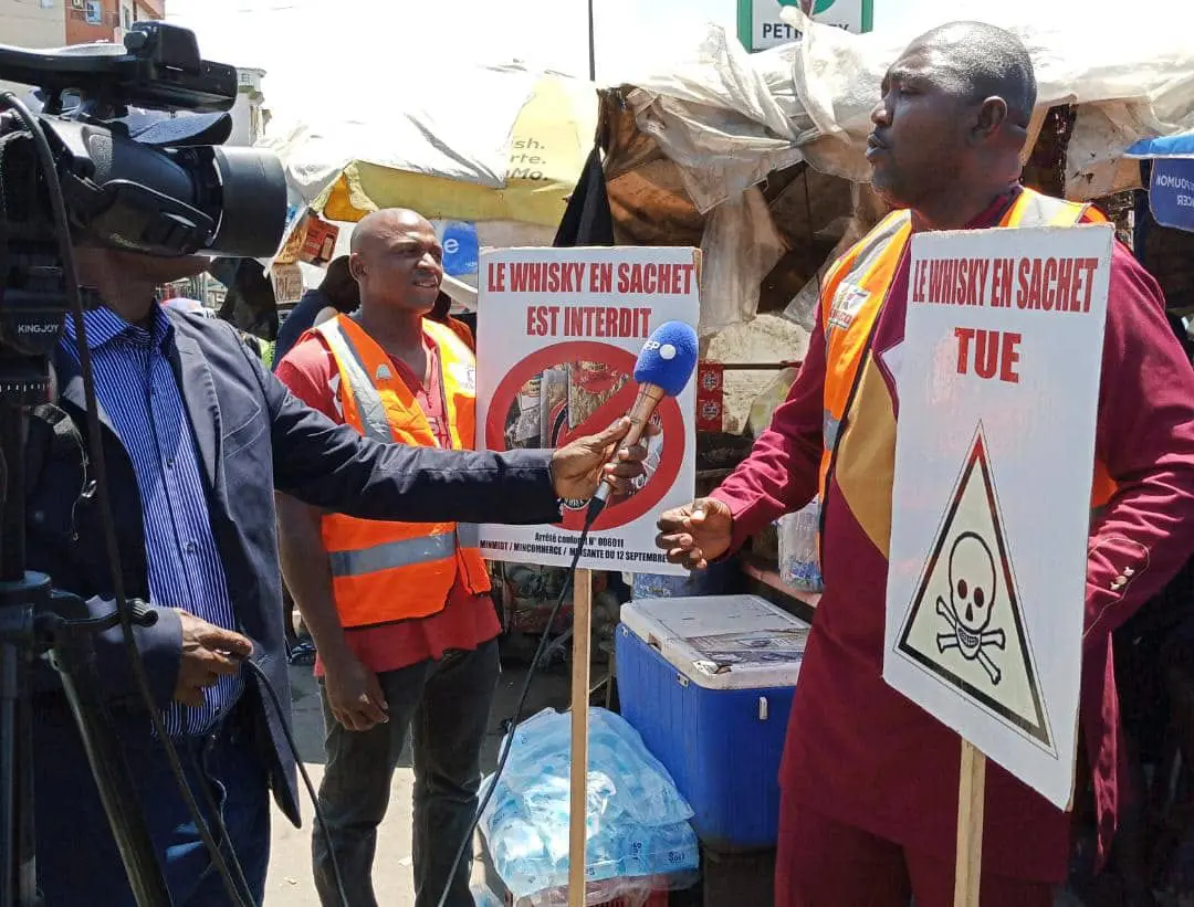 Au coeur de Douala, sur le très populaire et grouillant marché Mboppi, Alphonse Ayissi Abena et un collègue, gilets orange fluo sur le dos, se faufilent entre les étals et les taxi-motos qui fourmillent dans la ville, armés de leurs écriteaux "Le whisky en sachet tue".
